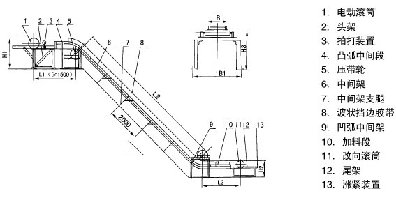 該系列產品主要用于散狀物料的大傾角連續輸送,采用具有波狀擋邊和橫隔板的輸送帶。輸送傾角為0-90°(70°以下最好),其特點為:用一臺設備在狹小的空間可完成水平傾斜輸送,具有通用帶式輸送機水平或小傾角輸送可靠高、節能和斗式提升物料可靠經濟的優點。本系列產品廣泛用于煤炭、糧食、建材、化工、水電和冶金等部門,在環境溫度為-19℃-+40℃內輸送堆積密度為0.5-2.5t/m3的各種散裝物料,對于輸送有特殊要求的物料,如耐高溫或具有酸、堿性、油類物質、有機浴劑等成分的物料,須在訂貨時提出,采用相應材料的特殊擋邊輸送帶。